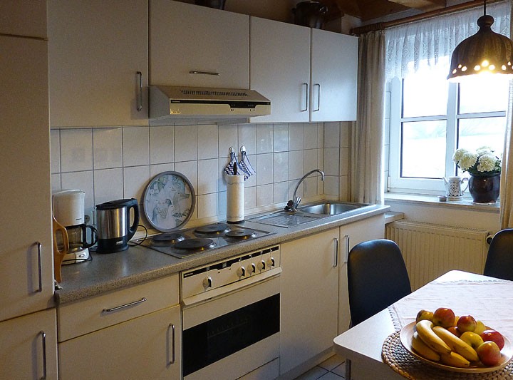Als wohnlicher Kontrast zum nordisch-klaren Stil der Einrichtung sind alle Zimmerdecken mit rustikalem Holz getäfelt. Mehr als seinen Reisekoffer muss niemand mitbringen: Die Einbauküche ist mit allen üblichen Utensilien ausgestattet. Das Bad, Wohn/Schlafzimmer (Schrankbett) sind komplett eingerichtet inklusive Bettwäsche und Handtücher. Fernseher, Radio, WLAN-Netz, Mikrowelle, Backofen und Geschirrspüler sind vorhanden.