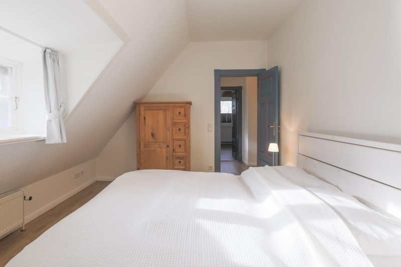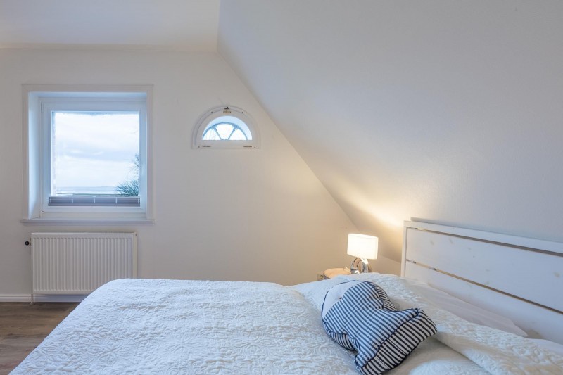 Im OG befinden sich zwei Schlafzimmer – eines davon mit TV und Meerblick – und jeweils einem Doppelbett (180 x 200) und ein Duschbad mit WC.