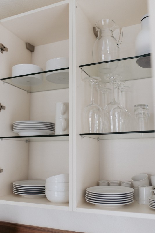 Die Küche ist vollständig mit Geschirr ausgestattet.