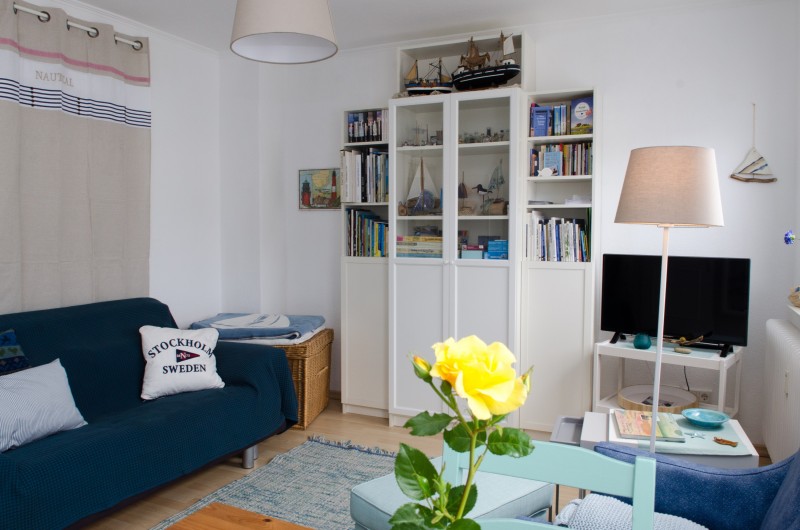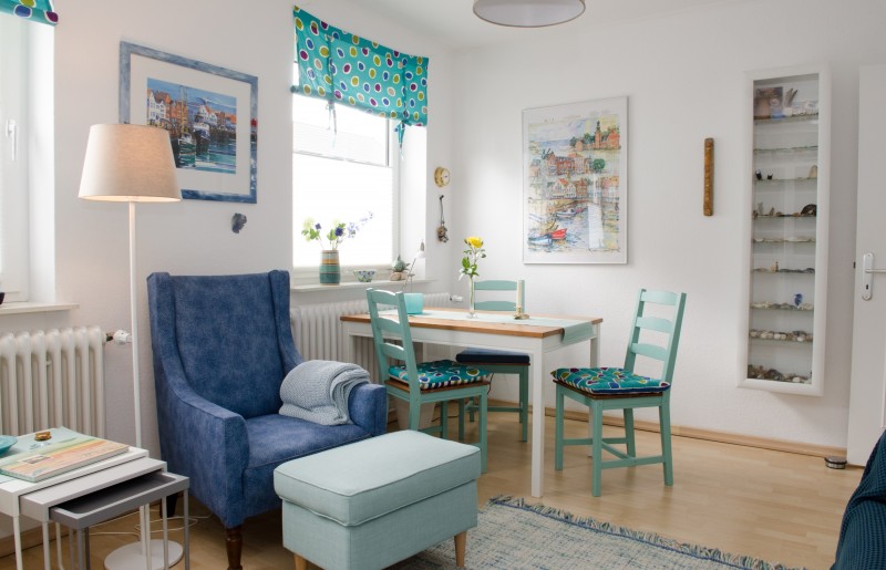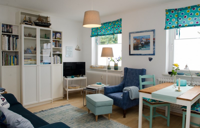 Wir bieten eine 56 qm große Gästewohnung an, im Mai 2018 neu eingerichtet, etwas persönlicher als üblich mit einer eigenen Bibliothek und reichlich Infomaterial und Spielen zu Nordfriesland, mit maritimen Dekos und Strandfunden, wie Muscheln, Strandholz und Bernsteinen. In der Werkstatt sind in einer Vitrine Bernsteine, bearbeitet zu besonderen Anhängern und Ketten, ausgestellt, die auch erworben werden können.