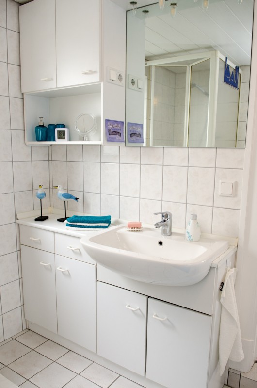 Sanitäre Ausstattung: Das Badezimmer sowie die separate Toilette haben ein Tageslichtfenster. Die Dusche hat einen niedrigen Einstieg. Es gibt einen Waschtisch mit Unterschrank, Schmink- / Spiegel und Föhn; Waschmaschine.