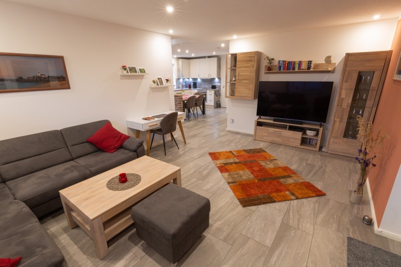 Im Wohnzimmer gibt es ein gemütliches Sofa, einen kleinen Schreibtisch, einen großen Smart-TV mit Festplatte und einen Blu-ray-Player.