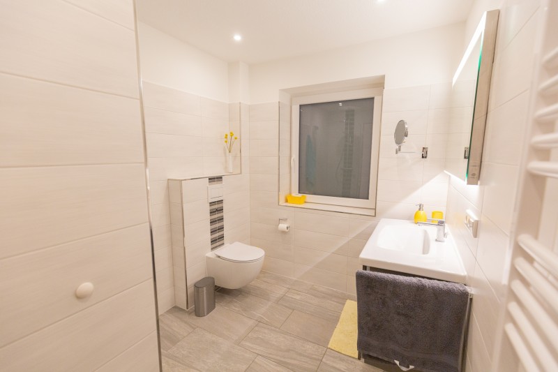 Sanitäre Ausstattung: Das neue und moderne Badezimmer hat eine ebenerdige Regendusche mit Handbrause, einen großen Waschtisch, einen beleuchteten Spiegel, einen Kosmetikspiegel, ein WC und einen Handtuch-Heizkörper.